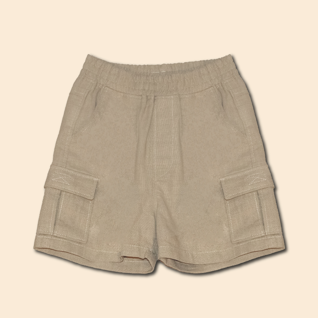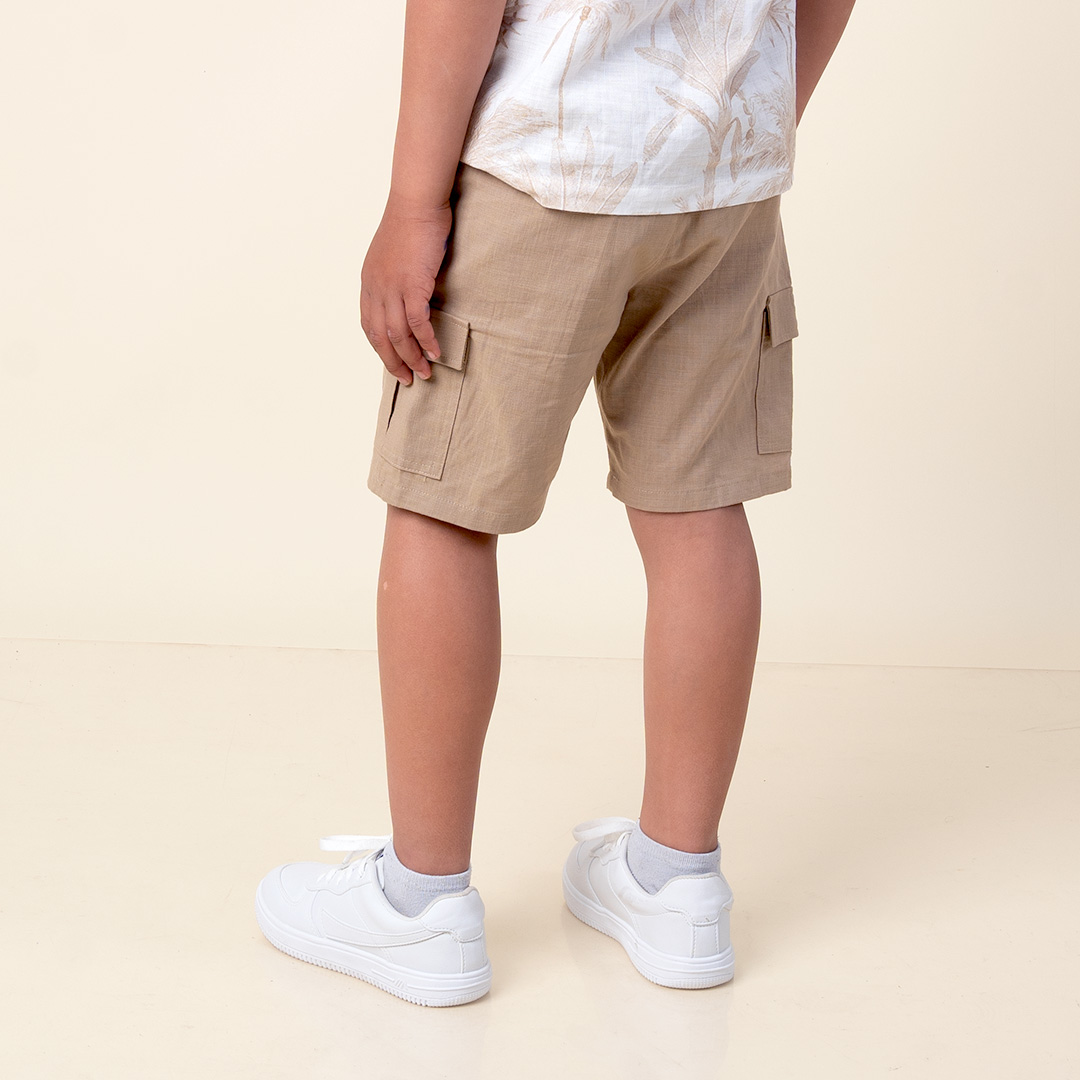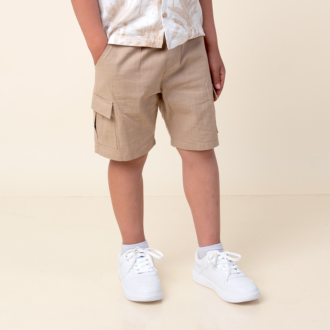 Bermuda de tela plana con bolsillos funcionales en delantero, bolsillos cargo en los laterales, cintura elasticada. Prenda hecha en 100% algodón.