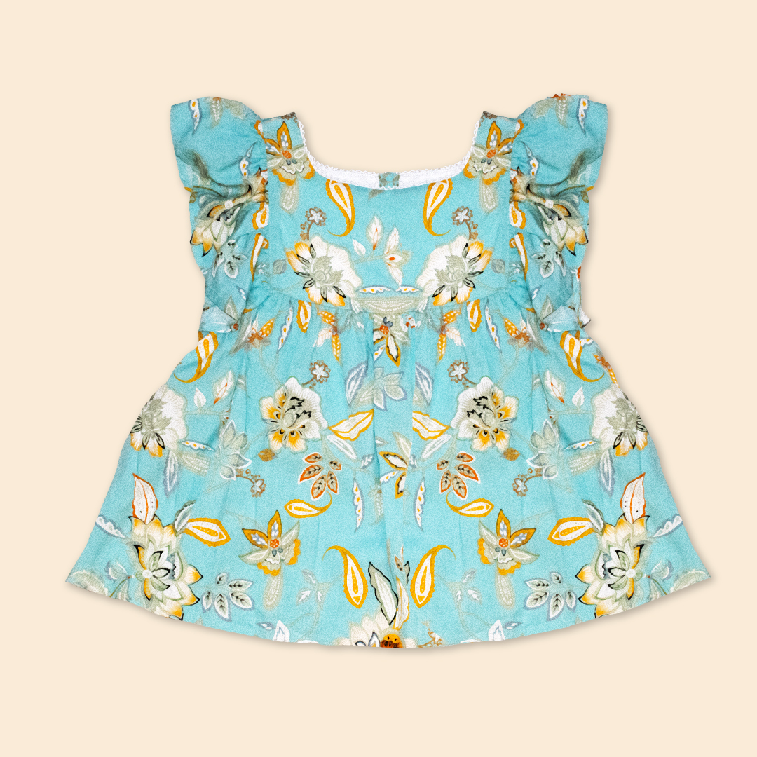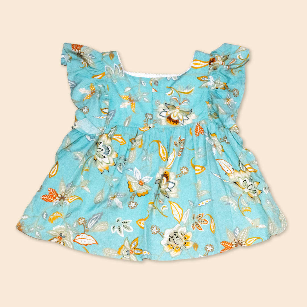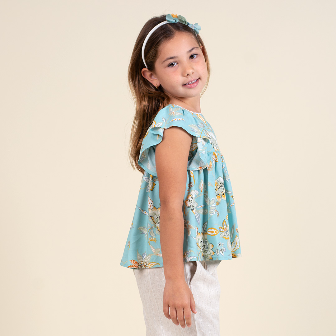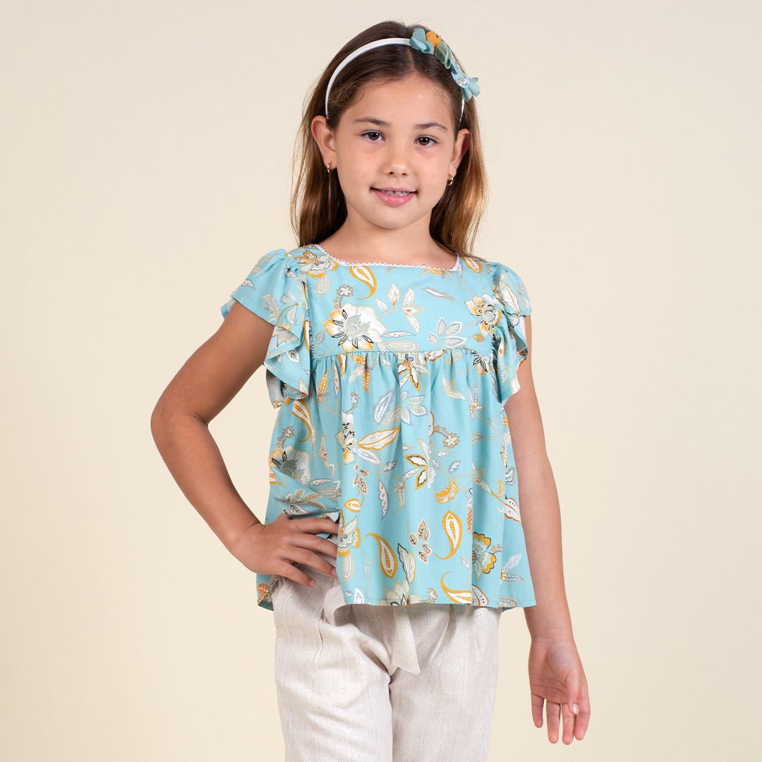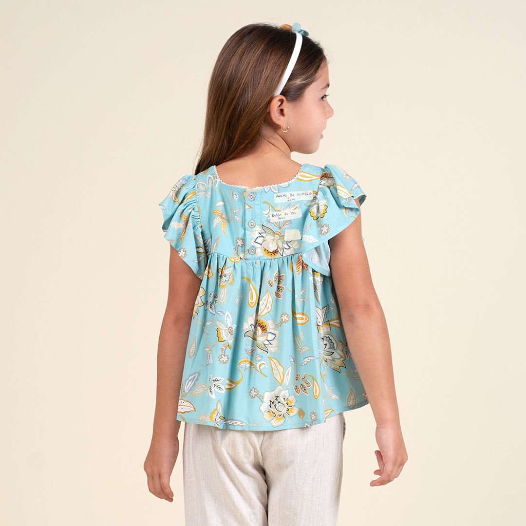 Blusa de tela estampada, escote recto, bobo fruncido en contorno de sisa, abertura en espalda con botones especiales, forro de 100% algodón peruano.