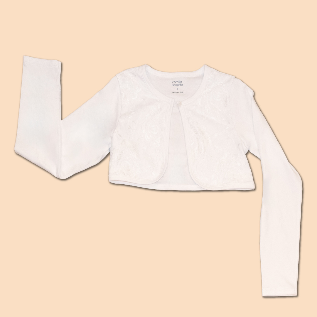 Bolero manga larga, escote redondo, piezas delanteras de encaje y botón especial. 100% algodón peruano