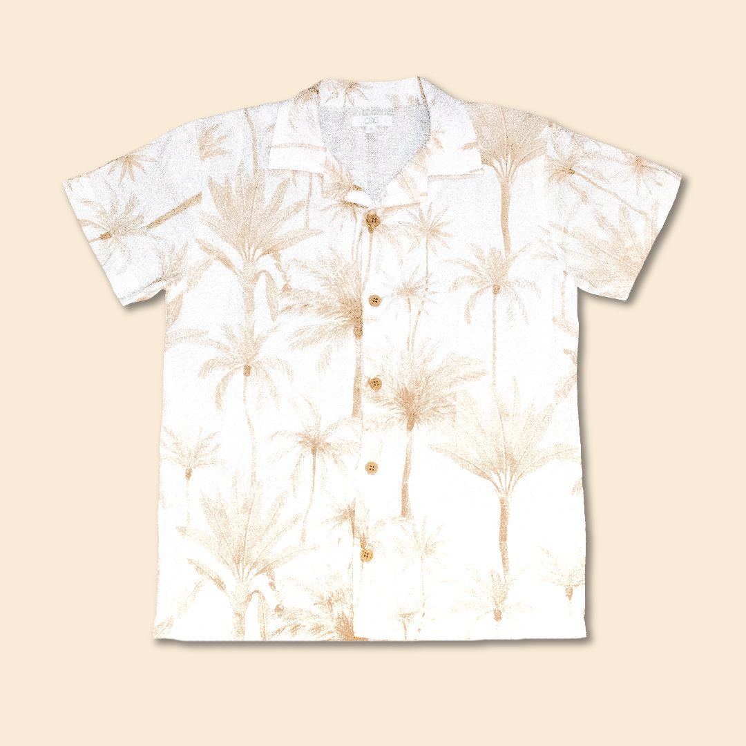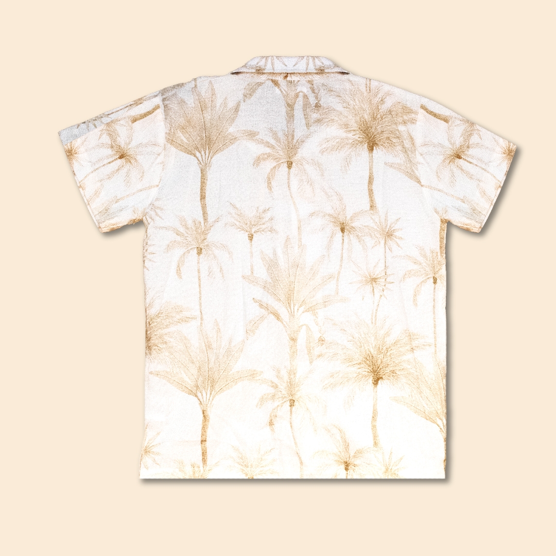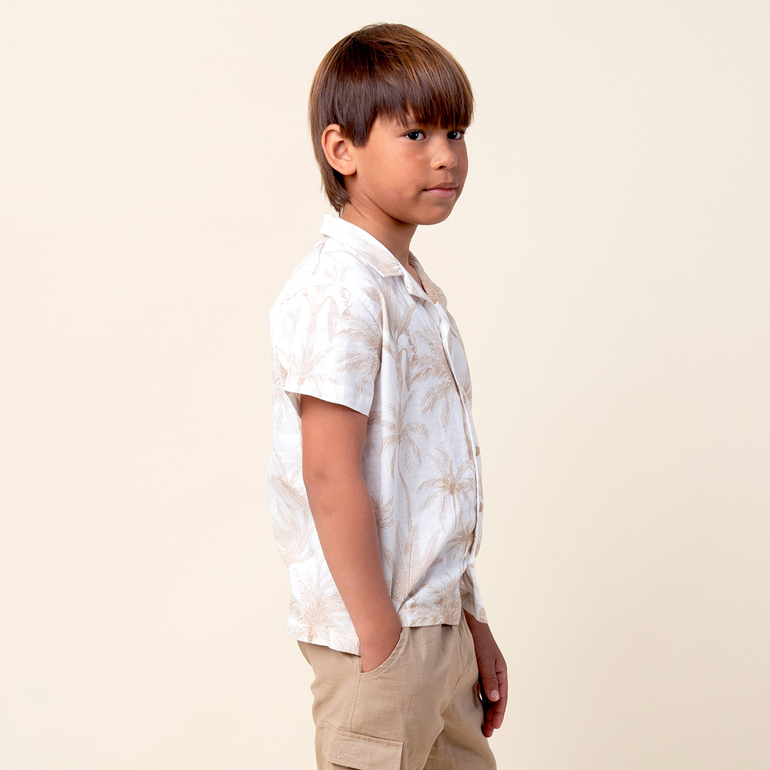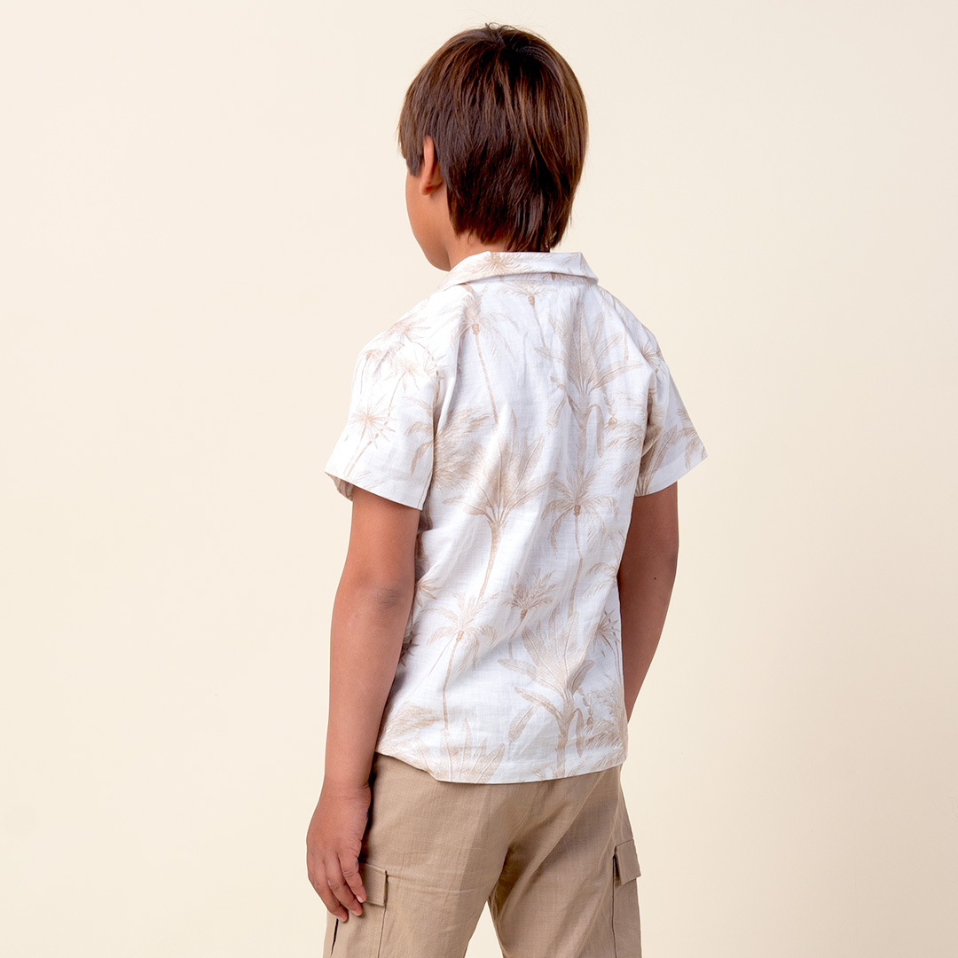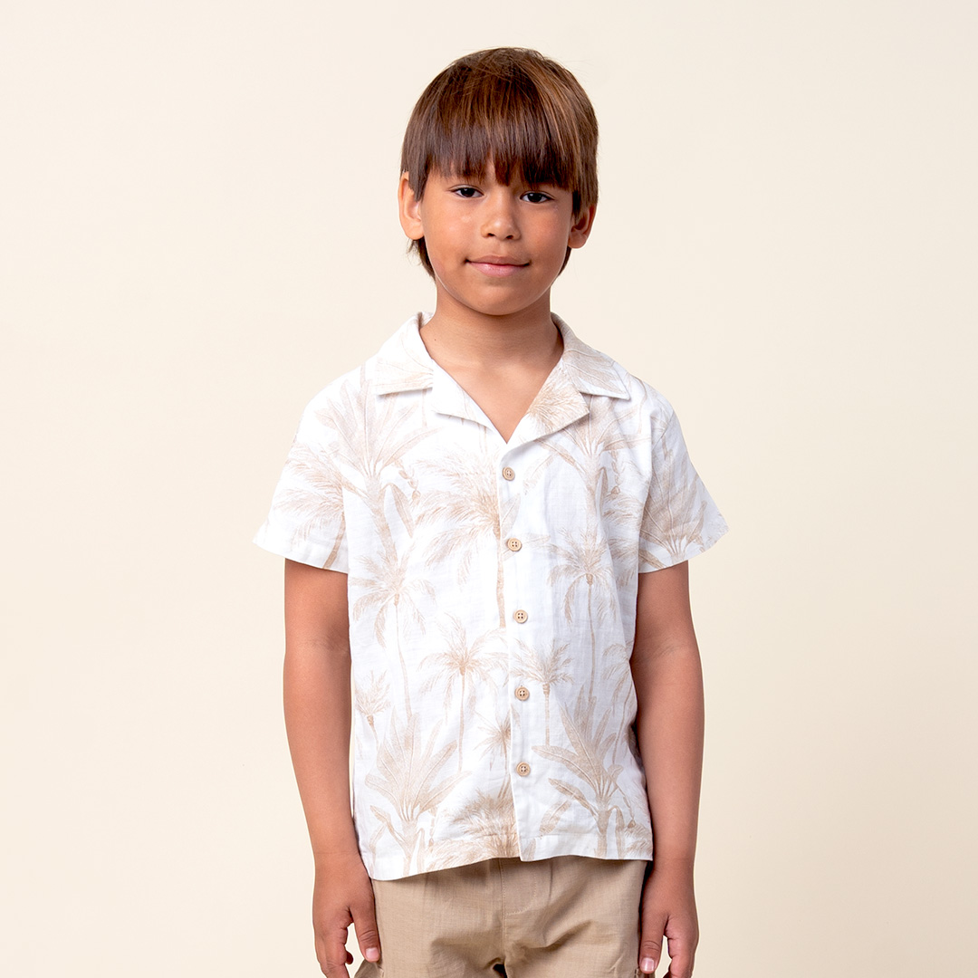 Camisa cuello sport manga corta de tela estampada con motivos de palmeras y botones especiales en delantero.
