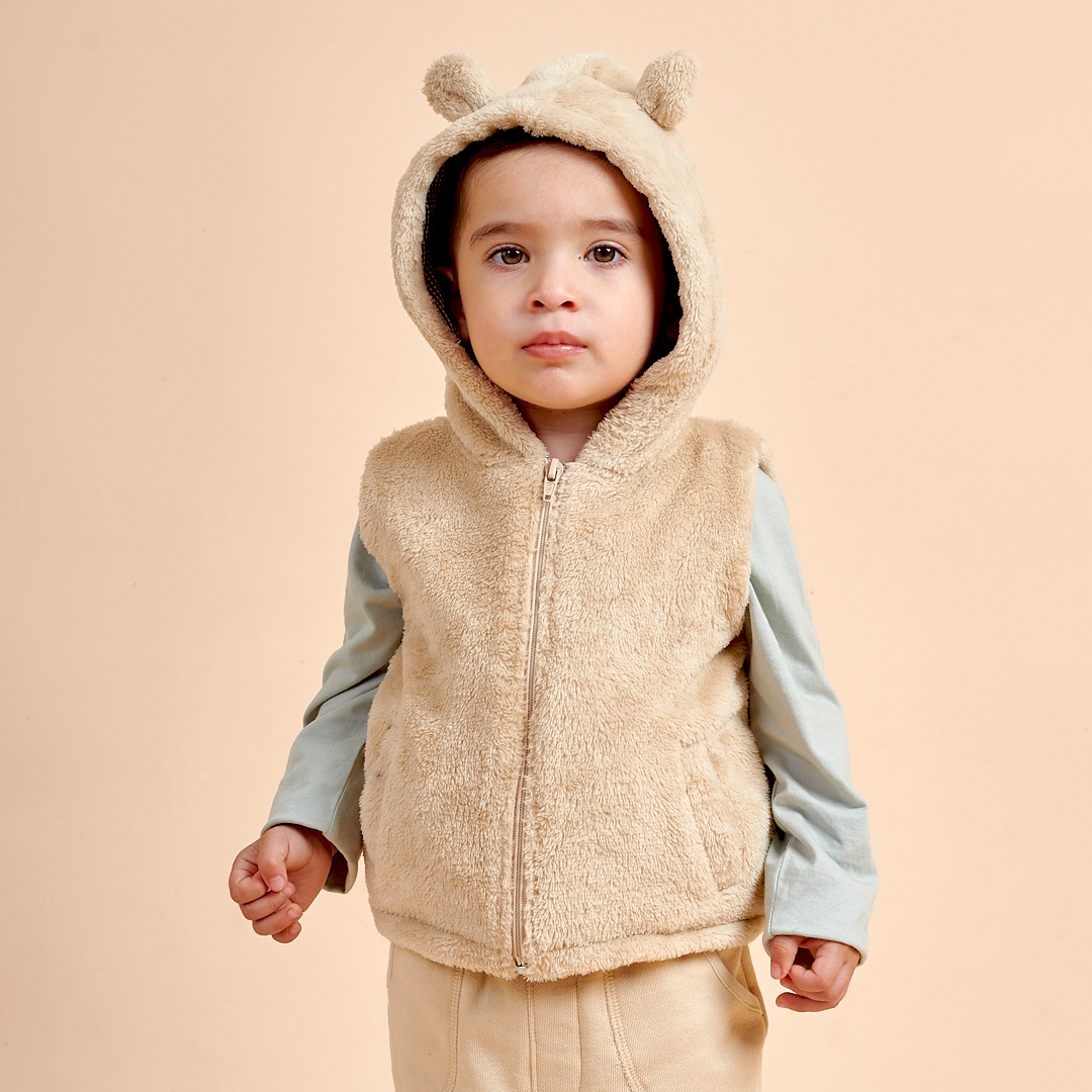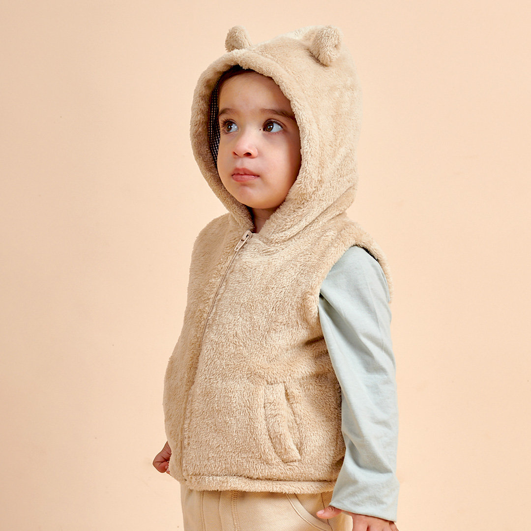 Chaleco de peluche con capucha y orejitas. Forro de tela plana, bolsillos funcionales y cierre nylon en delantero.