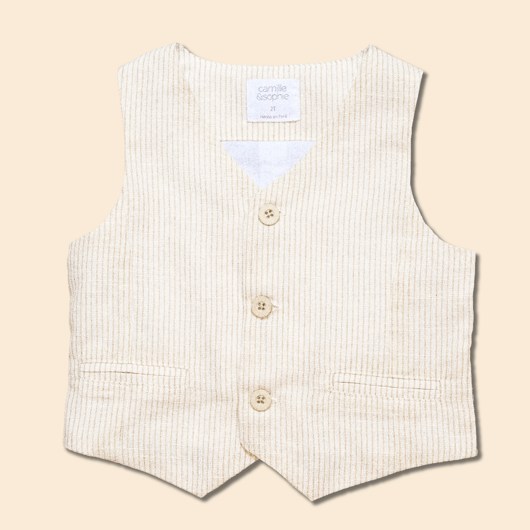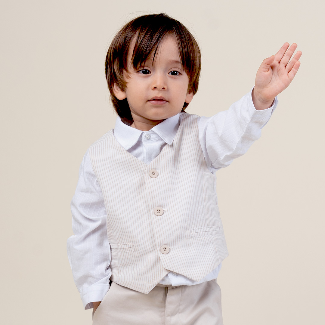 Chaleco de tela listada con cuello V, botones a tono en delantero, detalle de bolsillos simulados, espalda con elástico para dar mejor ajuste. Prenda hecha en 100% algodón.