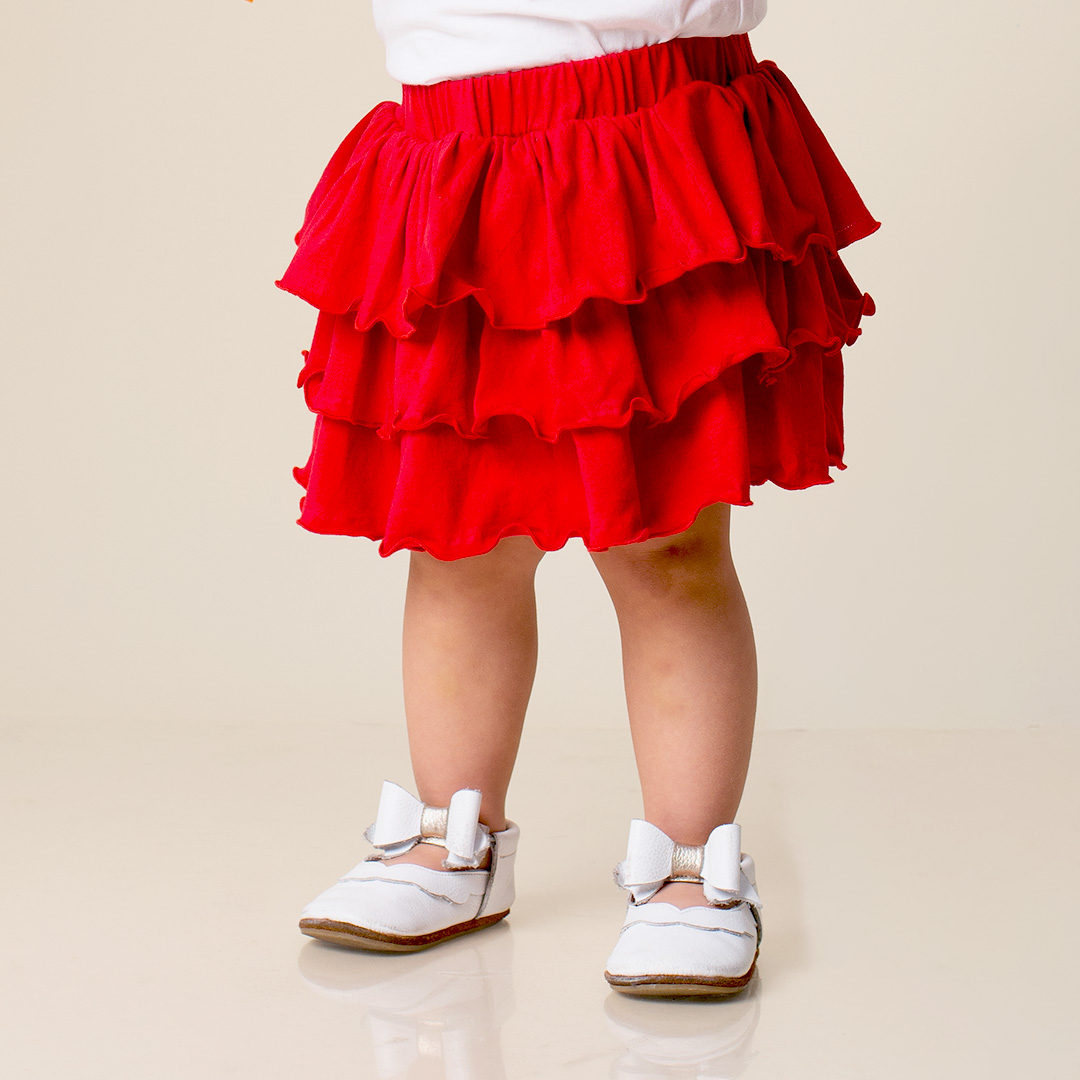 Falda con calzoncito incluido, bobos escalonados, cintura elasticada, detalle de lazo y forro de 100% algodón.