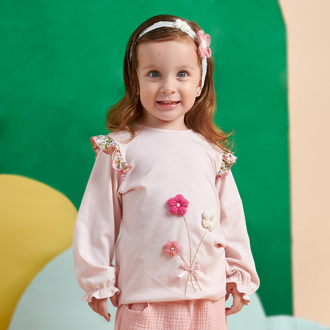 Polo manga larga escote redondo con bobitos fruncidos de seda estampada en contorno de sisa, puños de manga elasticada y delantero con aplicación de bordado y flores de crochet tejidas a mano.