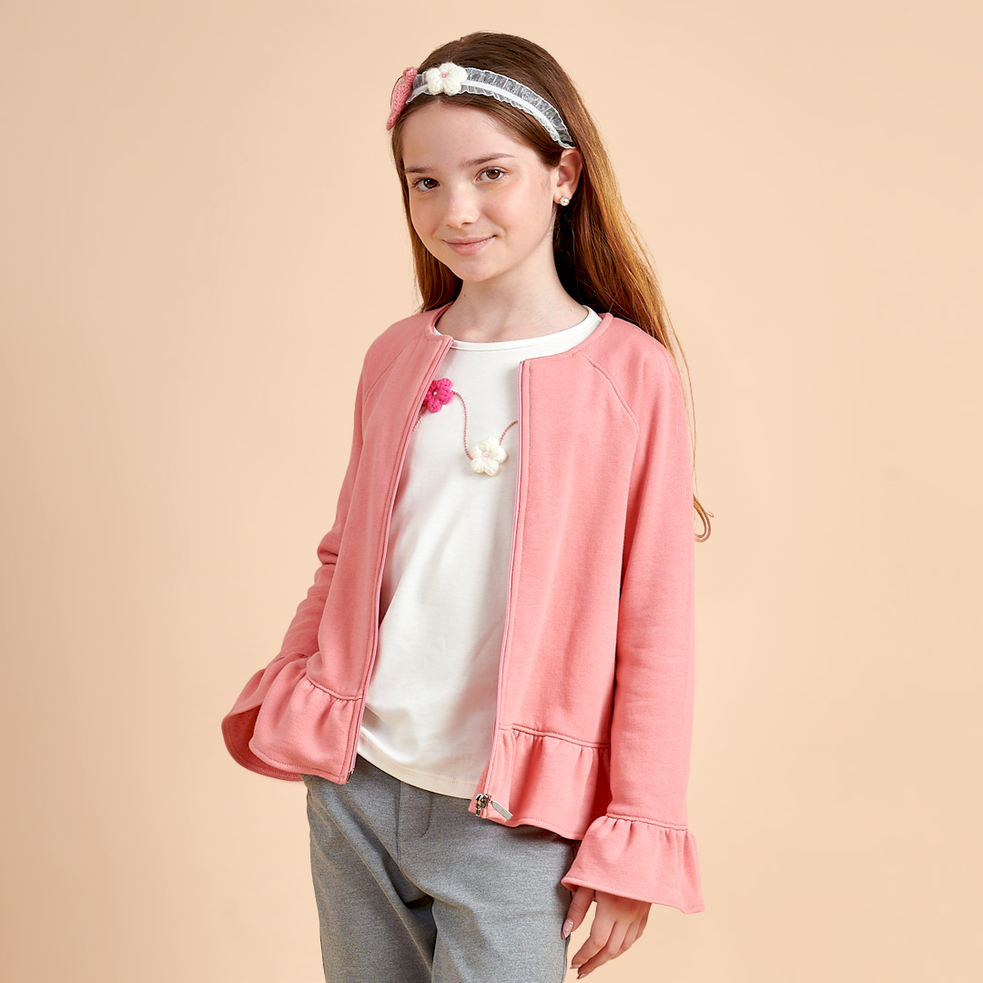 Polo manga larga con cortes verticales y bobo fruncido insertado, detalle bordado en delantero con aplicaciones de encaje y lazo.