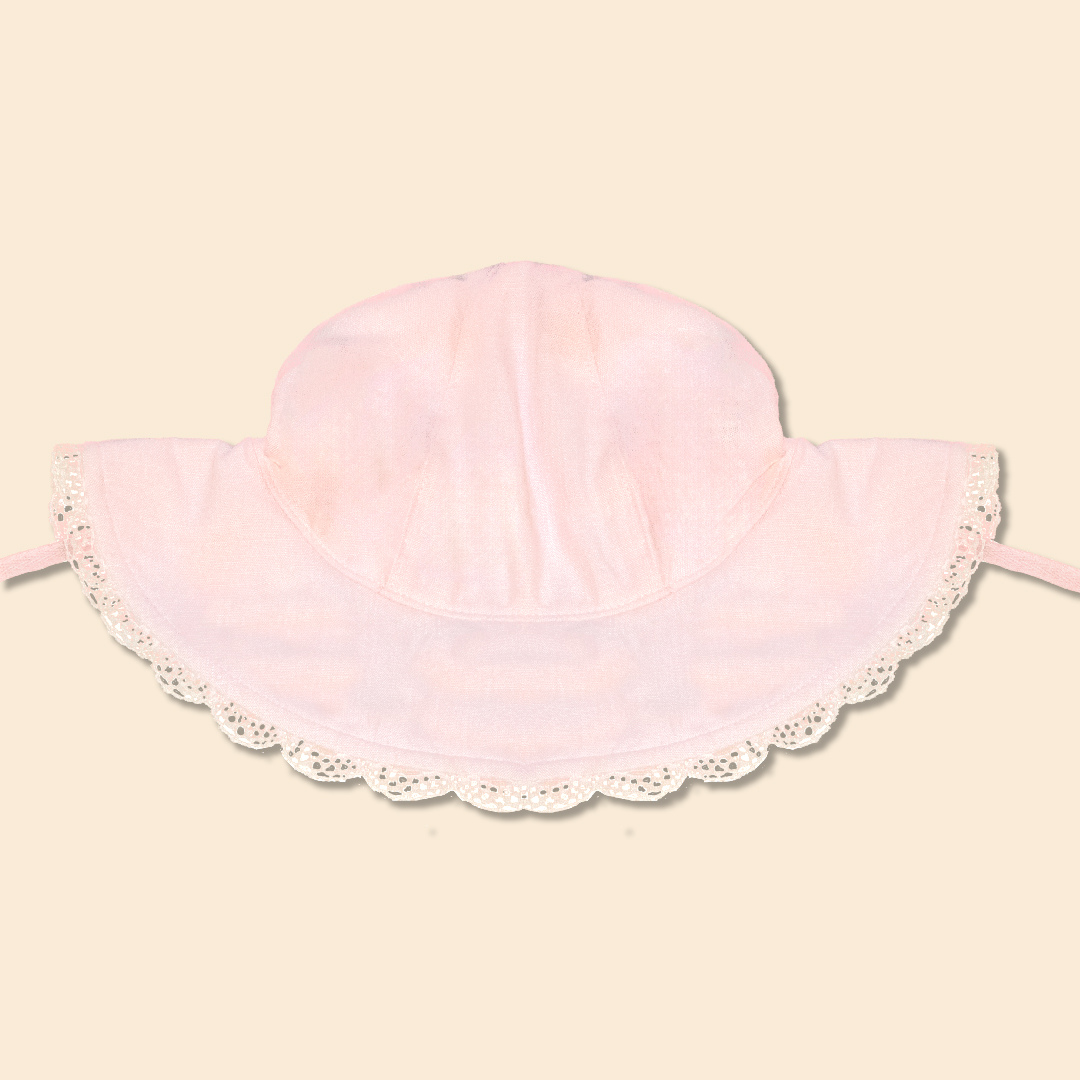 Sombrero forrado de tela plana con tiras para anudar y blonda decorativa en contorno del alero.