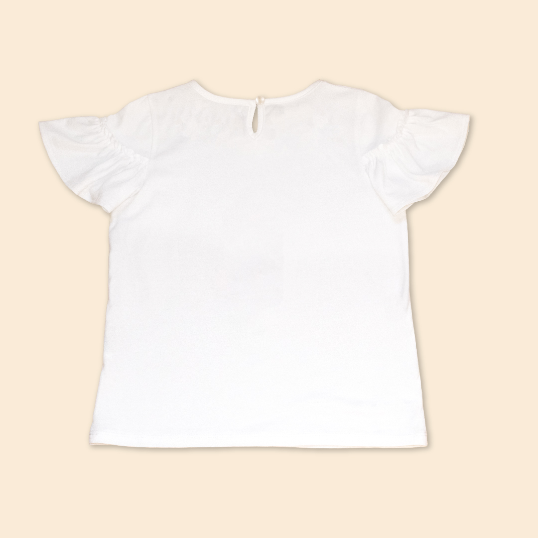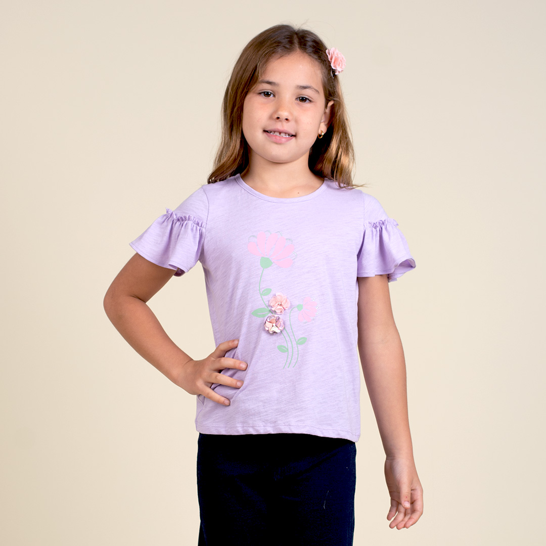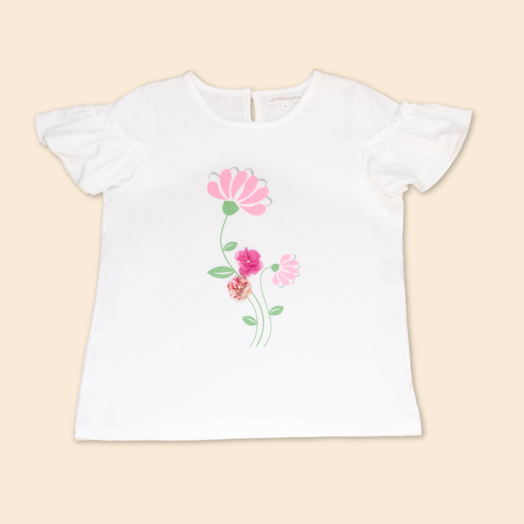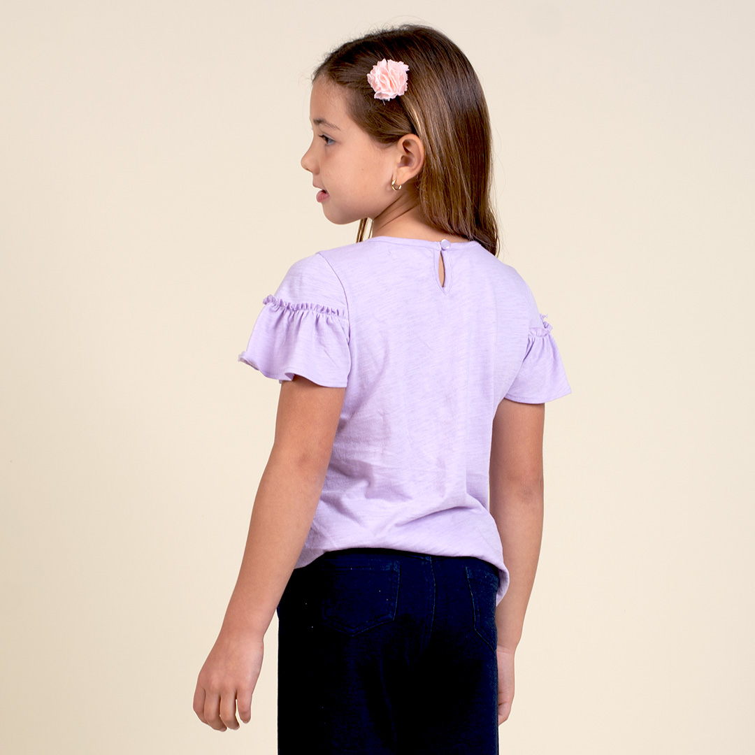 T-Shirt escote redondo con abertura en espalda y botones especiales, manga con volante fruncido. Estampado localizado en delantero inspirado en el florecimiento. Prenda hecha en 100% algodón peruano.