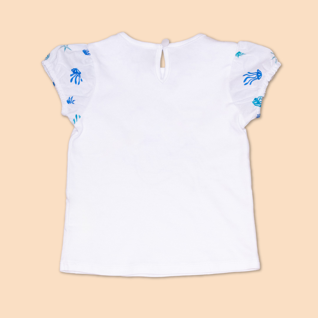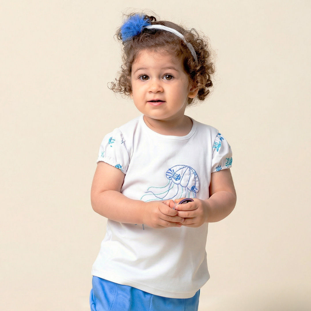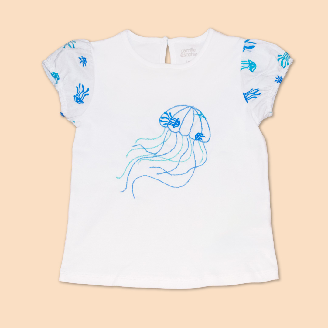 T-Shirt escote redondo con tajo en espalda y botón especial, manga corta elasticada de tela plana estampada . Bordado en delantero inspirado en las medusas. Prenda hecha en 100% algodón pima.
