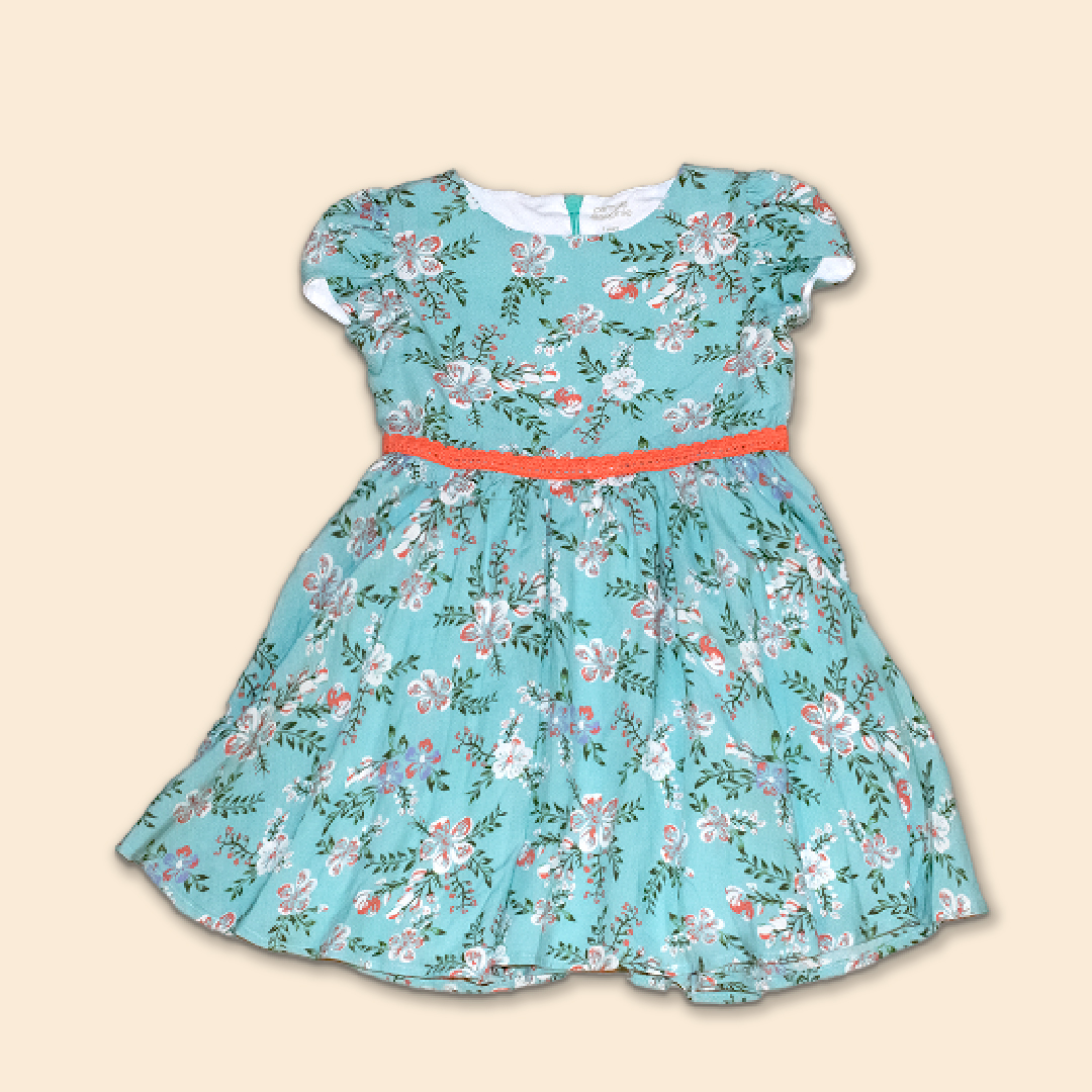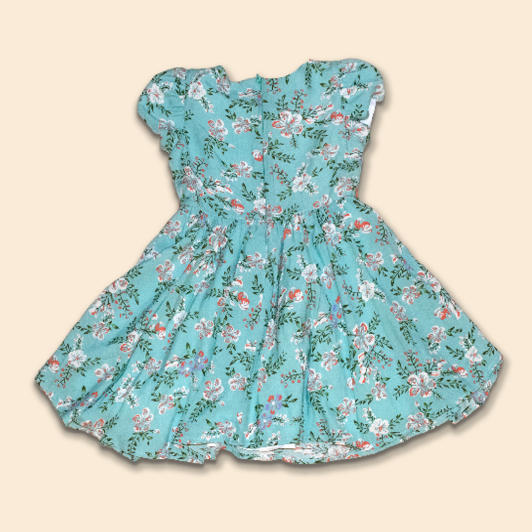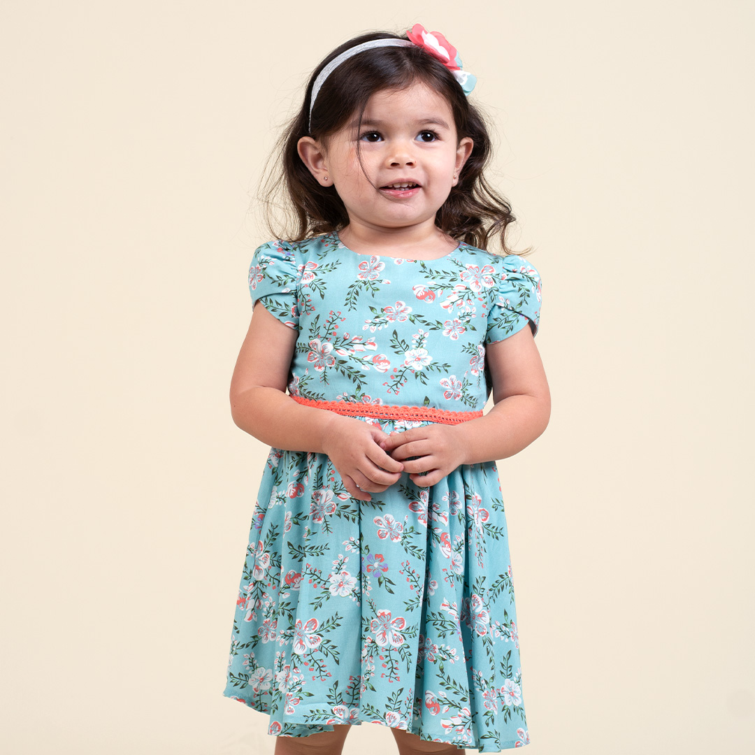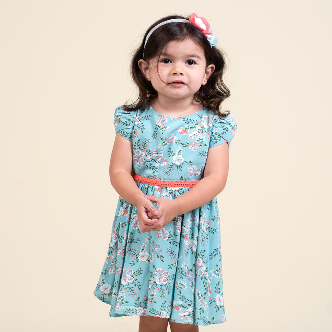 Vestido de tela estampada escote redondo, tipo de manga pétalo, corte a la cintura con fruncido en la falda, cintas en tono contraste cintura delantera y en contorno de faldón, cierre invisible en espalda, forro de 100% algodón peruano.