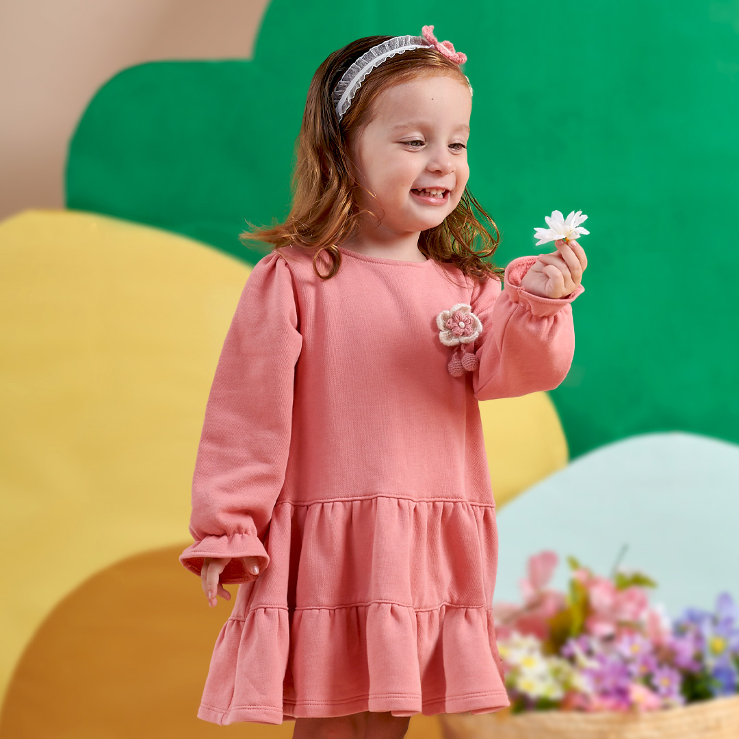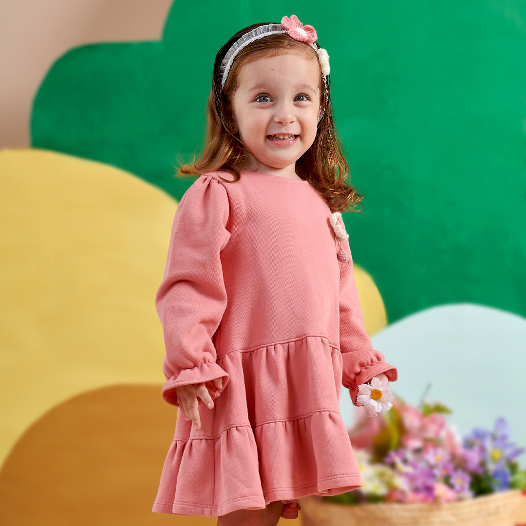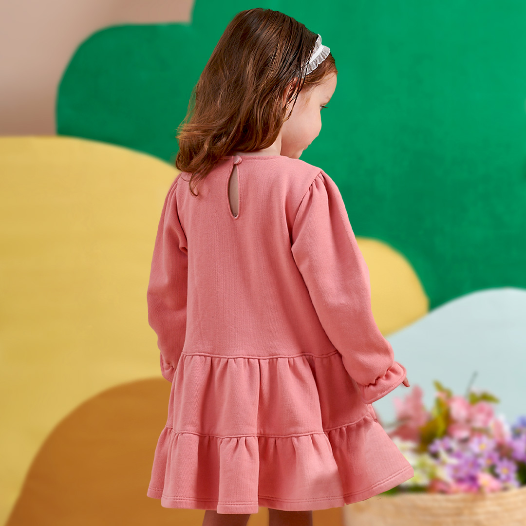 Vestido de franela manga larga con puños elasticados, falda con 2 cortes horizontales y fruncido en todo el contorno. Abertura en espalda con botones especiales y forro en tejido punto 100% algodón.