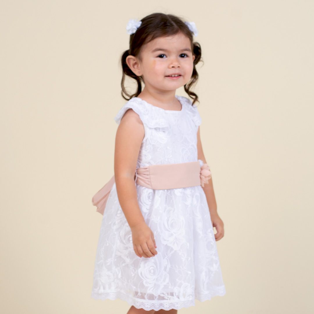 Vestido de encaje manga cero con volante fruncido sobrepuesto, escote redondo, falda fruncida en contorno de cintura,cinturón de gasa en tono contraste decorado con flores hechas artesanalmente de las mismas telas del vestido, cierre invisible en espalda y forro de 100% algodón peruano.